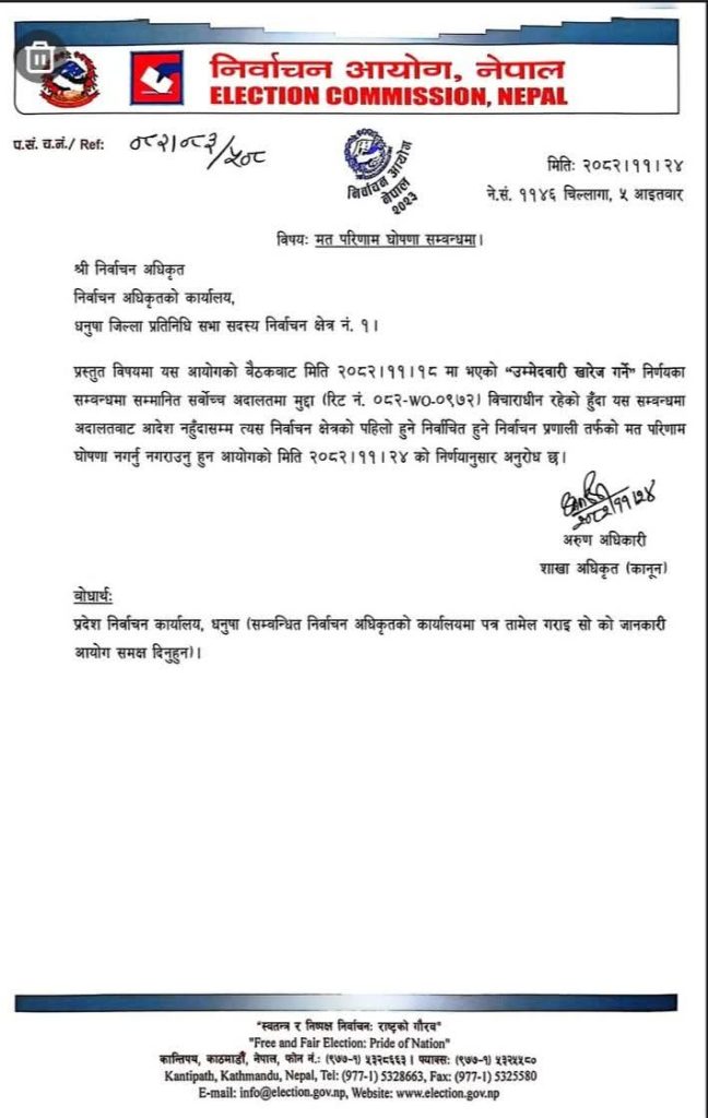 सो निर्णयका सम्बन्धमा सर्वोच्च अदालतमा मुद्दा परी विचाराधीन रहेकाले सो सम्बन्धमा अदालतबाट आदेश नभएसम्म धनुषा जिल्ला निर्वाचन क्षेत्र नं. १ को पहिलो हुने निर्वाचित हुने निर्वाचन प्रणालीतर्फको मत परिणाम घोषणा नगर्नु नगराउनुहुन आयोगको आजको निर्णयअनुसार अनुरोध गरिएको उहाँले हस्ताक्षर गर्नुभएको पत्रमा उल्लेख छ ।