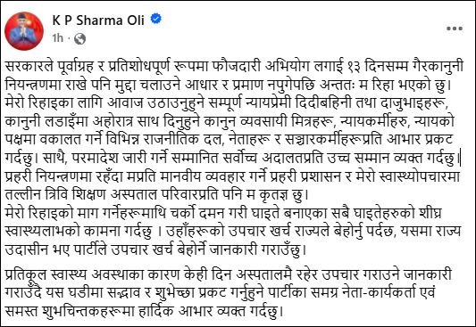 नेकपा एमालेका अध्यक्ष तथा पूर्वप्रधानमन्त्री केपी शर्मा ओली हिरासतमुक्त भएपछि आफूमाथि मुद्दा चलाउने आधार र प्रमाण नपुगेपछि रिहा भएको बताएका छन् ।