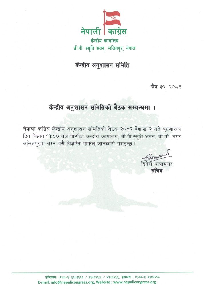 ‘नेपाली कांग्रेस केन्द्रीय अनुशासन समितिको बैठक २०८२ वैशाख २ गते बुधबारका दिन बिहान ११ः०० बजे पार्टीको केन्द्रीय कार्यालय, बीपीस्मृति भवन, बीपी नगर ललितपुरमा बस्ने यसै विज्ञप्ति मार्फत जानकारी गराइन्छ,’ सोमबार समितिका सचिव दिनेश थापामगरले जारी गरेको विज्ञप्तिमा उल्लेख छ ।