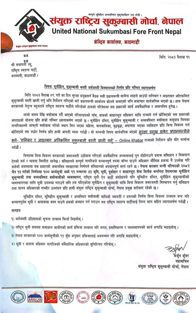विज्ञप्तिमा लामो समयदेखि बसोबास गर्दै आएका परिवारहरूको गाँस, बासको आधारभूत अधिकार माथि राज्यले गर्न खोजेको यस प्रकारको अपराधको योजनाप्रति हाम्रो गम्भीर ध्यानाकर्षण भएको छ ।