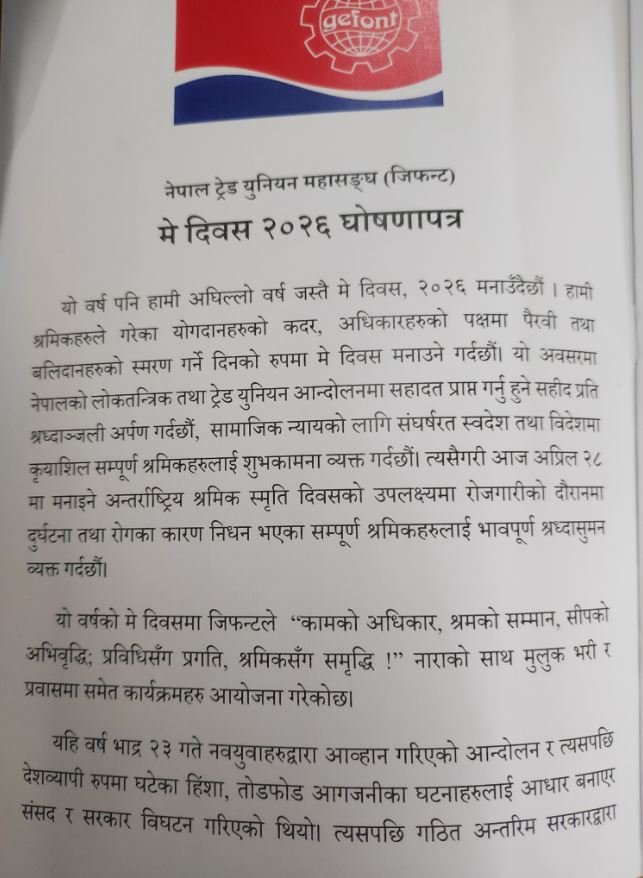 जिफन्टले मे दिवसका अवसरमा श्रमिकका मुद्दा सम्बोधन गर्न सरकारसँग विभिन्न माग अघि सारेको छ ।