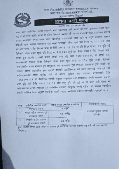 ‘हिजो मन्त्रीज्यूको निर्देशनमा हामीले अन्तर प्रदेशस्तरीय भाडा ५ प्रतिशत वृद्धि गरेका छौँ ’ उनले भने । यात्रुवाहक र ढुवानीका दुवै सवारीमा ५ प्रतिशतले भाडा वृद्धि भएको छ ।