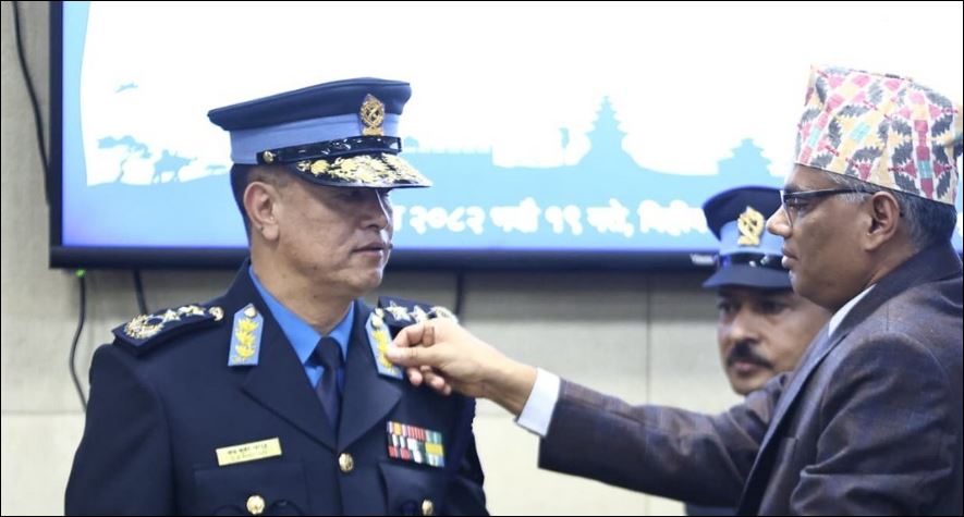 काठमाडौं । नवनियुक्त प्रहरी महानिरीक्षक चन्द्रकुवेर खापुङलाई दर्ज्यानी चिह्न प्रदान गरिएको छ । गृह मन्त्रालयका सचिव गोकर्णमणि दुवाडीले बिहीबार गृह मन्त्रालयमा आयोजित समारोहमा फुली लगाइदिएका हुन् । भदौ १३ मा बसेको मन्त्रिपरिषद्ले उनलाई ३२औँ महानिरीक्षक...