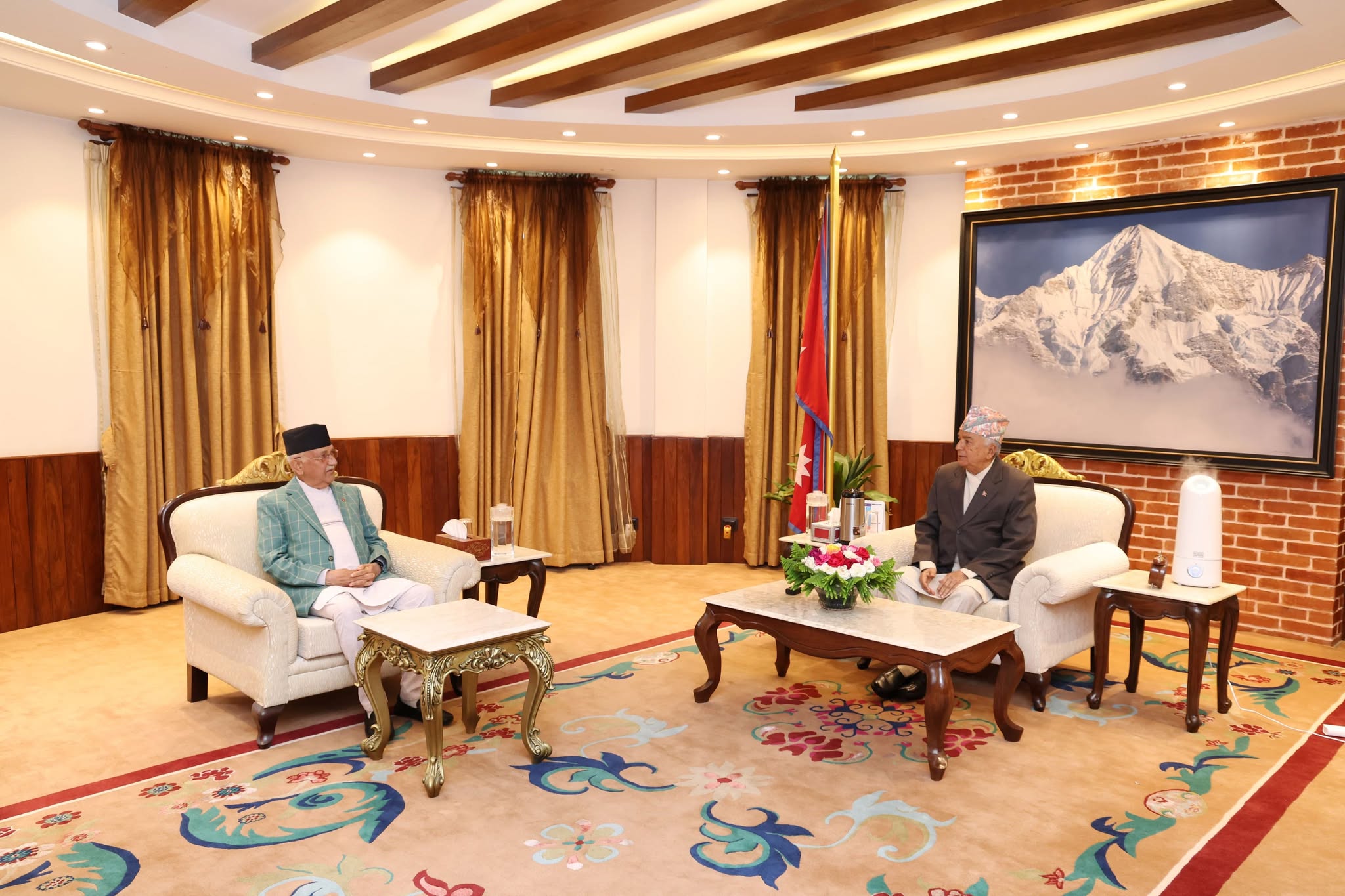 काठमाडौं । राष्ट्रपति रामचन्द्र पौडेलसँग प्रधानमन्त्री केपी शर्मा ओलीले भेटवार्ता गरेका छन् । आइतबार बिहान प्रधानमन्त्री ओली राष्ट्रपति भेट्न शीतलनिवास पुगेका हुन् । राष्ट्रपति र प्रधानमन्त्रीबिचको भेटवार्ता नियमित भएको प्रधानमन्त्रीको सचिवालयले...