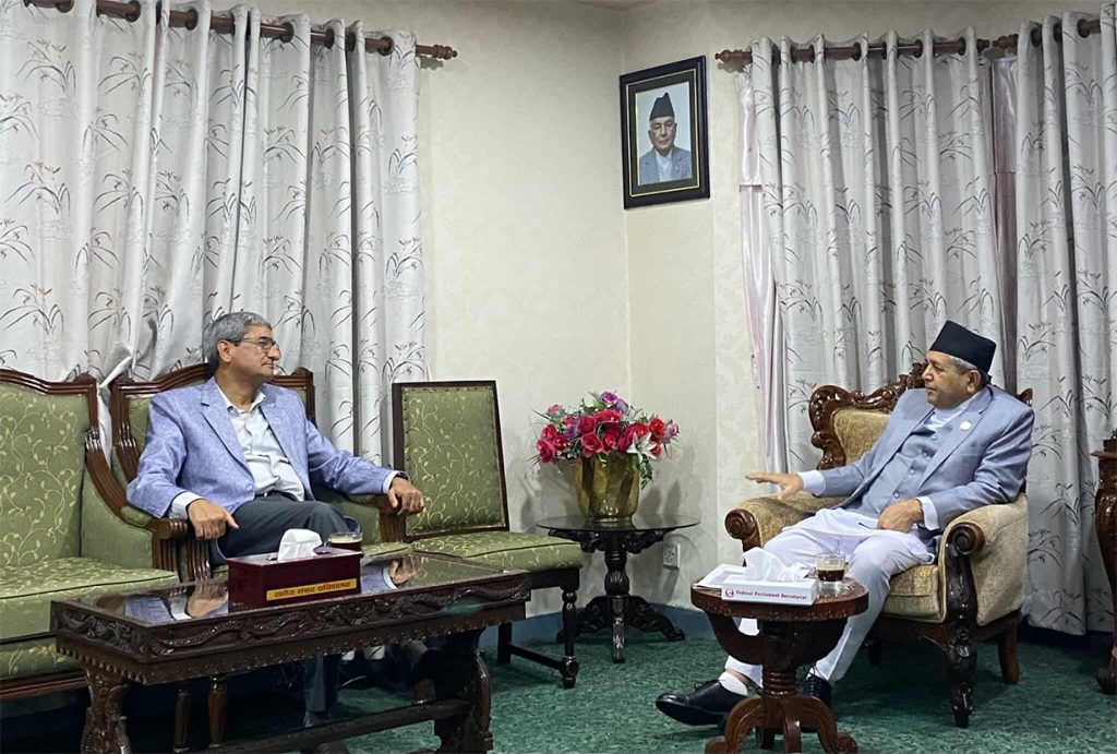 काठमाडौं । सभामुख देवराज घिमिरे र गृहमन्त्री रमेश लेखकबीच भेटवार्ता भएको छ । सिंहदरबारमा भएको भेटमा सहज रुपमा संसद सन्चालनको वातावरण बनाउने विषयमा छलफल भएको थियो । नेकपा एमाले र नेकपा माओवादी केन्द्रसँग भएको २ बुँदे सहमति कार्यान्वयन, रास्वपाको माग...