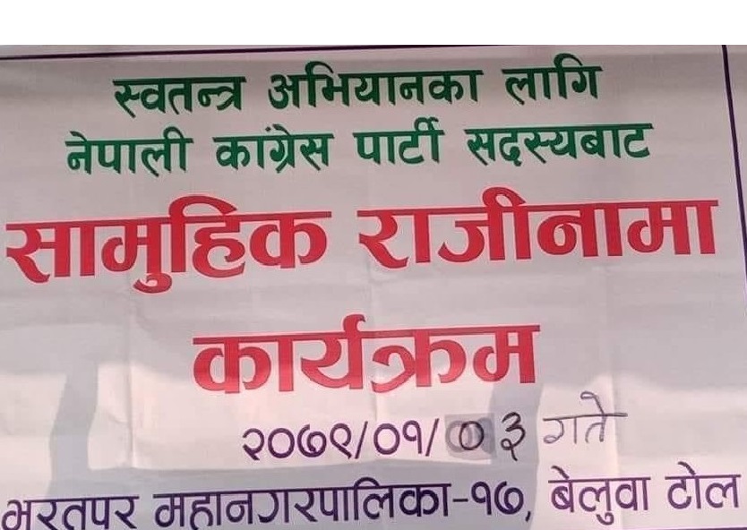 पोखरा । भरतपुर महानगरपालिकामा नेपाली कांग्रेसका दर्जनौं कार्यकर्ताले राजीनामाको घोषणा गरेका छन् । मेयर पद अर्को पार्टीलाई दिन लागिएको विरोधमा शनिबार दर्जनौं कांग्रेस कार्यकर्ताले पार्टी सदस्यबाट राजीनामाको घोषणा गरेका हुन् । शनिबार भरतपुर-१७ बेलुवा...