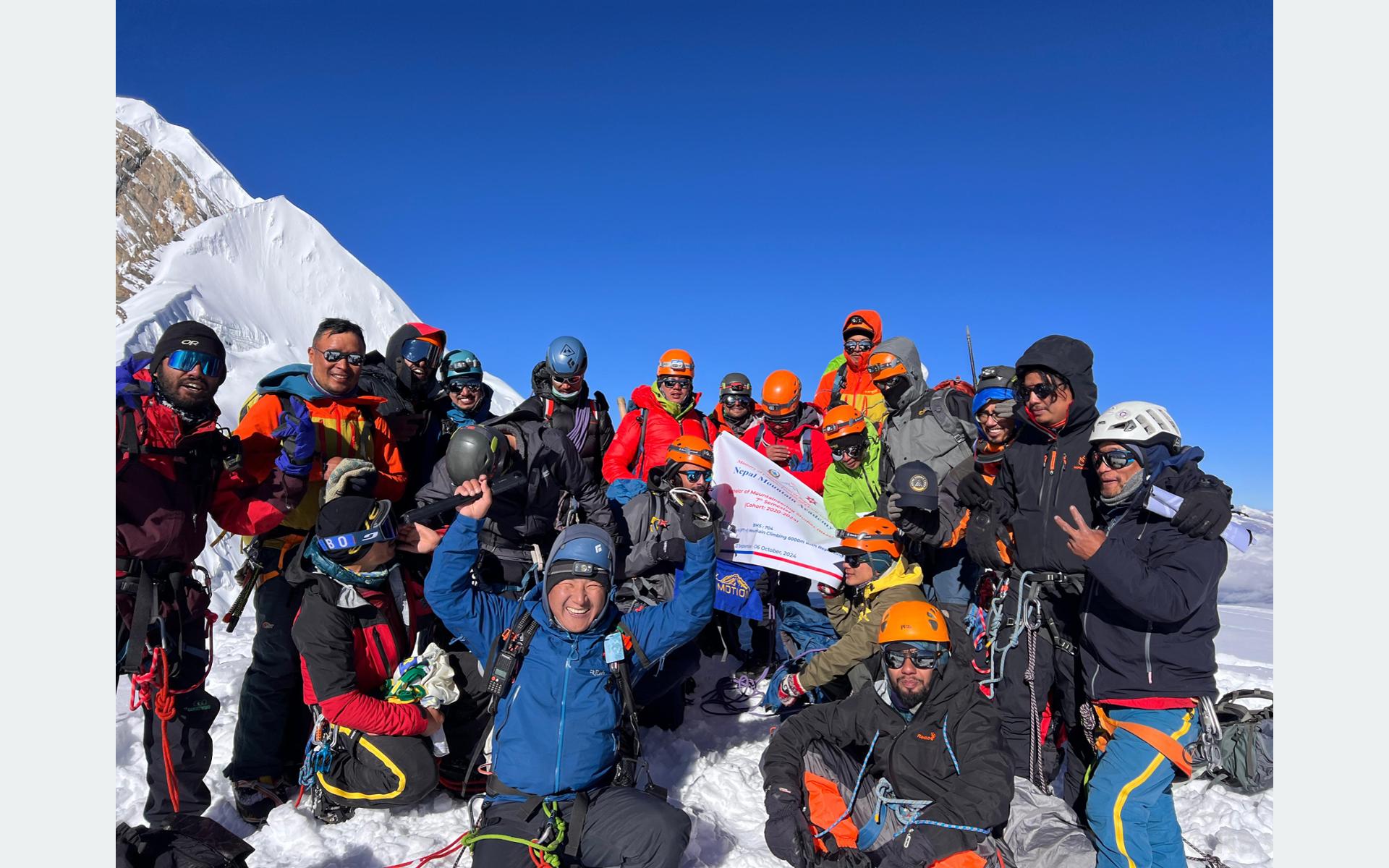 काठमाडौँ । हिमाल आरोहणबारे अध्ययन गरिरहेका नेपाल माउण्टेन एकेडेमीका विद्यार्थीहरु मनाङको थोरङ हिमचुली क्षेत्र पुगेका छन् ।एकेडेमीका सातौँ ‘सेमेस्टर’ का १६ विद्यार्थीले छ हजार एक सय मिटर अग्लो थोरङ हिमचुलीसमेत आरोहण गरे । उनीहरुले यही असोज १७ गते बिहीबारका...