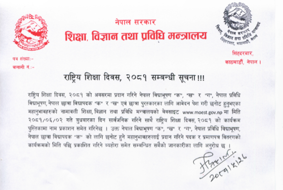 काठमाडौँ । भोलि हुने राष्ट्रिय शिक्षा दिवसको तयारी पुरा भएको छ । शिक्षा, विज्ञान तथा प्रविधि मन्त्रालयले दिवसको आवश्यक तयारी पुरा भएको जनाएको हो । यो वर्ष ‘ज्ञान, विज्ञान, सिप, उद्यम र मौलिकतास् साझेदारी र प्रणालीगत सक्षमता’ भन्ने आदर्श वाक्यका साथ...
