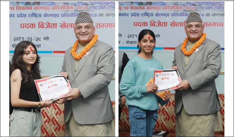 पोखरा । पोखराको सृजनाचोक स्थित सृजना सेकेन्डरी स्कुलको कक्षा ८ मा अध्ययनरत प्रतिभावान छात्राहरू राजश्री अधिकारी र सक्रिया पोखेल राष्ट्रिय खेलकुद प्रतियोगितामा बिजेता भई पुरस्कृत भएका छन् । प्रदेश खेलकुद परिषद गण्डकीले पोखरामा शनिवार एक कार्यक्रम आयोजना...