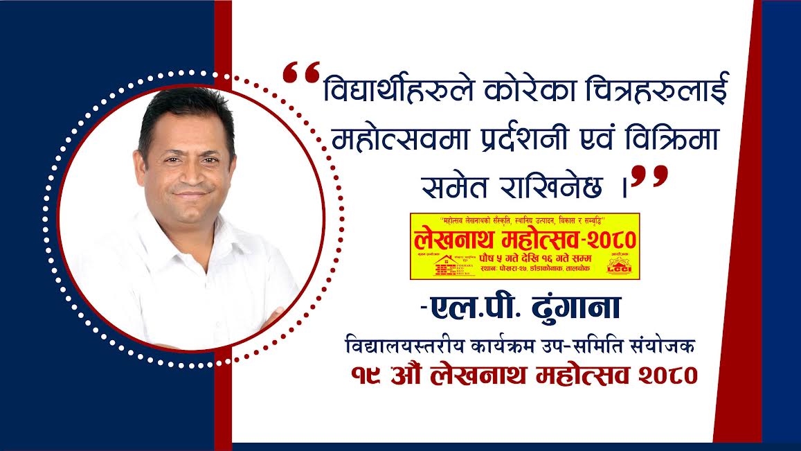 लेखनाथ । लेखनाथ उद्योग वाणिज्य संघले यहि पुष ५ गते देखि १६ गते सम्म आयोजना गर्ने १९ औ संस्करणको लेखनाथ महोत्सवमा विद्यालय स्तरीय चित्रकला प्रतियोगिता हुने भएको छ । पुस १ गते चित्रकला प्रतियोगिता गर्ने निर्णय भएको विद्यालयस्तरीय कार्यक्रम उप–समितिका...