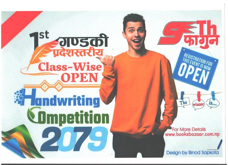 पोखरा । पोखरामा प्रथम खुल्ला गण्डकी प्रदेशस्तरीय हस्तलेखन प्रतियोगिता २०७९ हुने भएको छ । “सुरु गरौं लेख्न राम्रो अक्षर बाबुनानी, सुन्दर हस्तलेखन कलाले हामीलाई बनाउँछ ज्ञानी” भन्ने नाराका साथ बुक्स बजार सप्लायर्सले उक्त प्रतियोगिता आयोजना गर्न लागेको हो...
