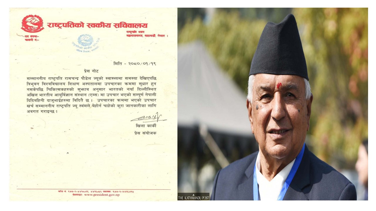पोखरा । राष्ट्रपति रामचन्द्र पौडेलले उपचार खर्च आफै व्यहोर्ने भएका छन् । राष्ट्रपतिको स्वकीय सचिवालयले आज प्रेस नोट जारी गदै यस्तो जानकारी दिएको । राष्ट्रपतिका प्रेस संयोजक खिला कार्कीले प्रेस नोट जारी गदै लेखेका छन्, उपचारका क्रममा भएको खर्च सम्माननीय...