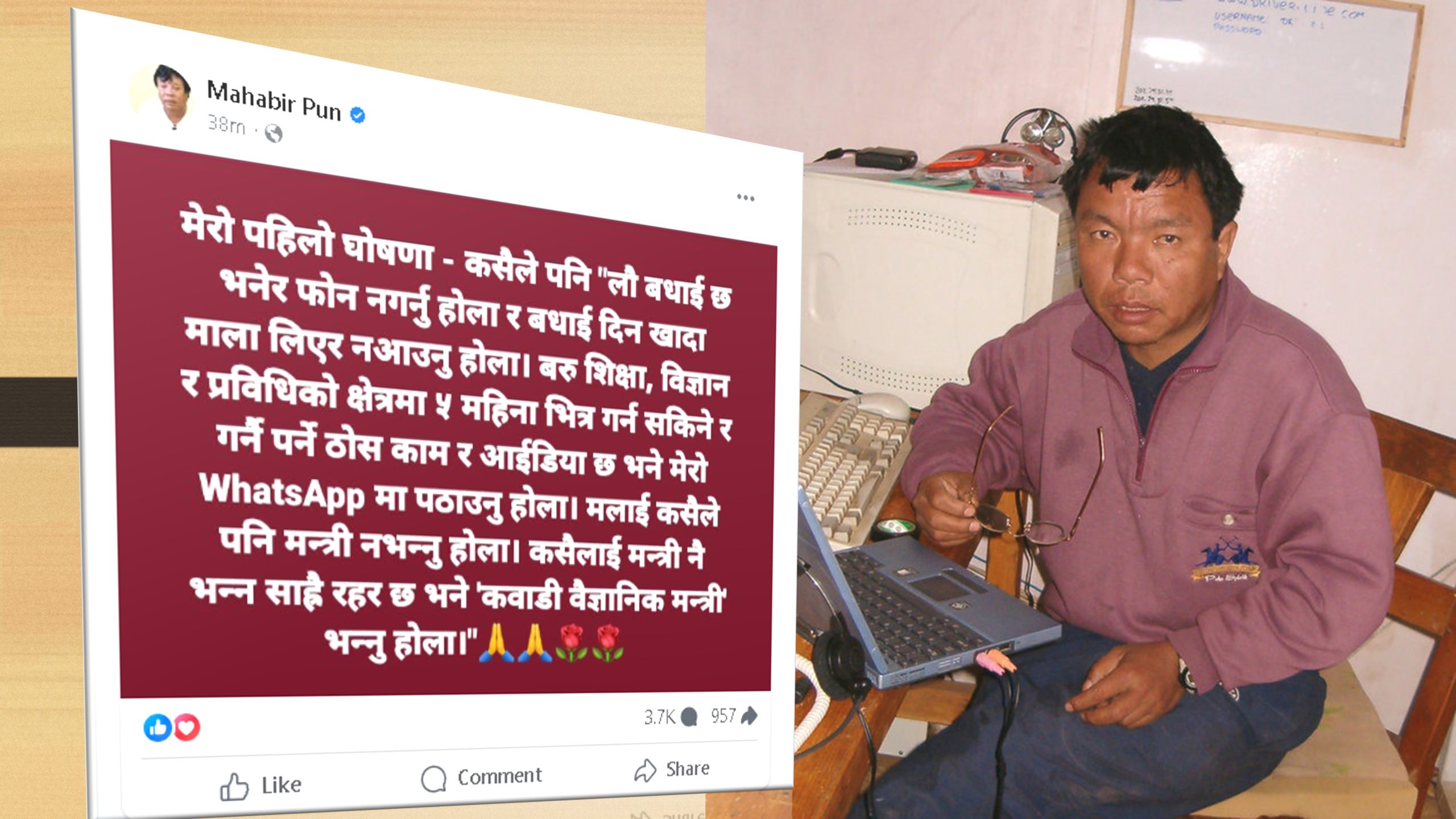 पोखरा । शिक्षा विज्ञान तथा प्रविधिमन्त्रीको सपथ लिने तयारीमा रहेका वैज्ञानिक महावीर पुनले आफूलाई बधाई नदिन र मन्त्री नभन्न आग्रह गरेका छन् । सामाजिक सञ्जाल फेसबुकमा पोष्ट गर्दै उनले यस्तो आग्रह गरेका हुन् । पुनले आफूले पाँच महिनाको अबधिमा गर्नसक्ने...