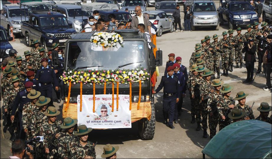 काठमाडौँ । पुर्वसभामुख दमननाथ ढुंगानाको अन्त्येष्टि गरिएको छ । ढुंगानाको सोमबार राजकीय सम्मानका साथ पशुपति आर्यघाटमा अन्त्येष्टि गरिएको हो । ढुंगानालाई छोराहरु निमेष र निशेषले दागबत्ती दिए । त्यसक्रममा नेपाली सेनाको एक टोलीले सलामी अर्पण गर्नुका साथै...