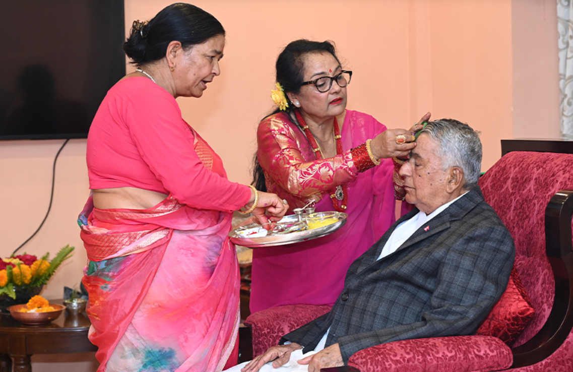 काठमाडौं । राष्ट्रपति रामचन्द्र पौडेलले बहिनीहरू शारदा पण्डित र चन्दा ओझाबाट ११ बजेर ३७ मिनेटको शुभसाइतमा विधिपूर्वक तिहारको टीका लगाएका छन् । राष्ट्रपति पौडेललाई उहाँहरूले राष्ट्रपति भवनमा टीका लगाइदिएका हो । उनीहरूले स्नेहपूर्वक राष्ट्रपतिलाई ओखर,...