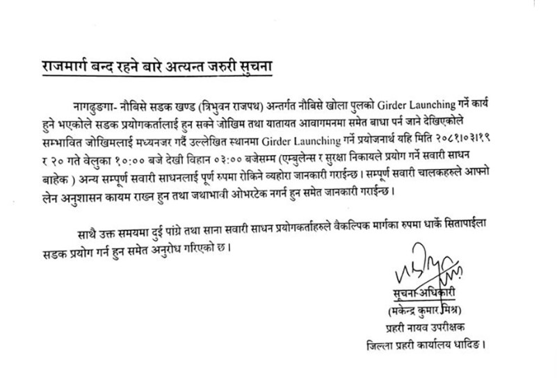 काठमाडौं । नागढुंगा नौबिसे सडक खण्ड राती दुई दिन रातको समयमा बन्द हुने भएको छ ।धादिङ हुदै काठमाडौं भित्रिने मुख्य राजमार्ग त्रिभुवन राजपथमा पर्ने उक्त सडक खण्ड असार १९ आज र २० गते भोली राती १० बजेदेखि बिहान ३ बजे सम्म बन्द हुने धादिङ प्रहरीले जनाएको...