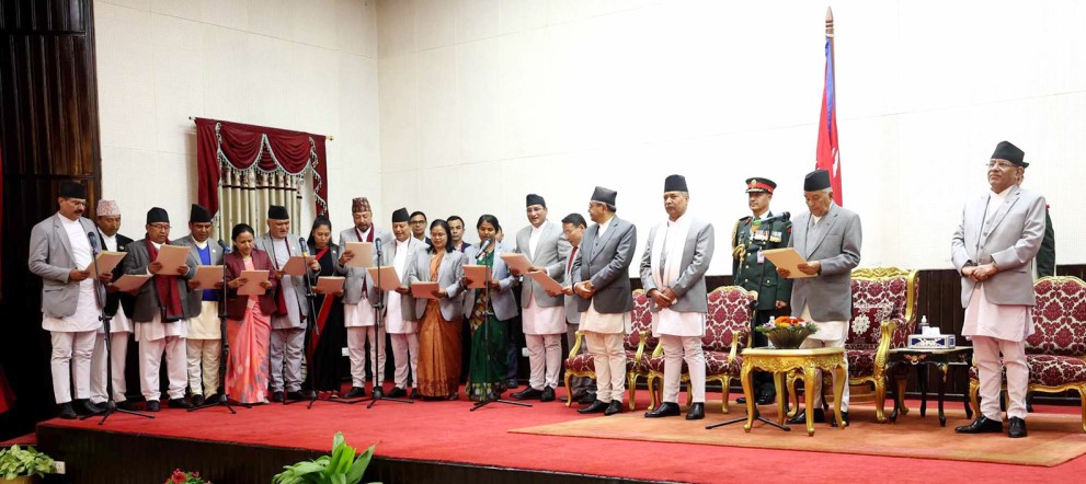 पोखरा । नवन्युक्त १६ मन्त्रीले पद तथा गोपनीयताको शपथ लिएका छन् । नेकपा एमाले, नेकपा माओवादी केन्द्र, राष्ट्रिय स्वतन्त्र पार्टी र नेकपा एकीकृत समाजवादीका तर्फबाट नवनियुक्त तीन उपप्रधानमन्त्रीसहित १० मन्त्रीले शपथ लिएका हुन् । राष्ट्रपति भवन शीतलनिवासमा...