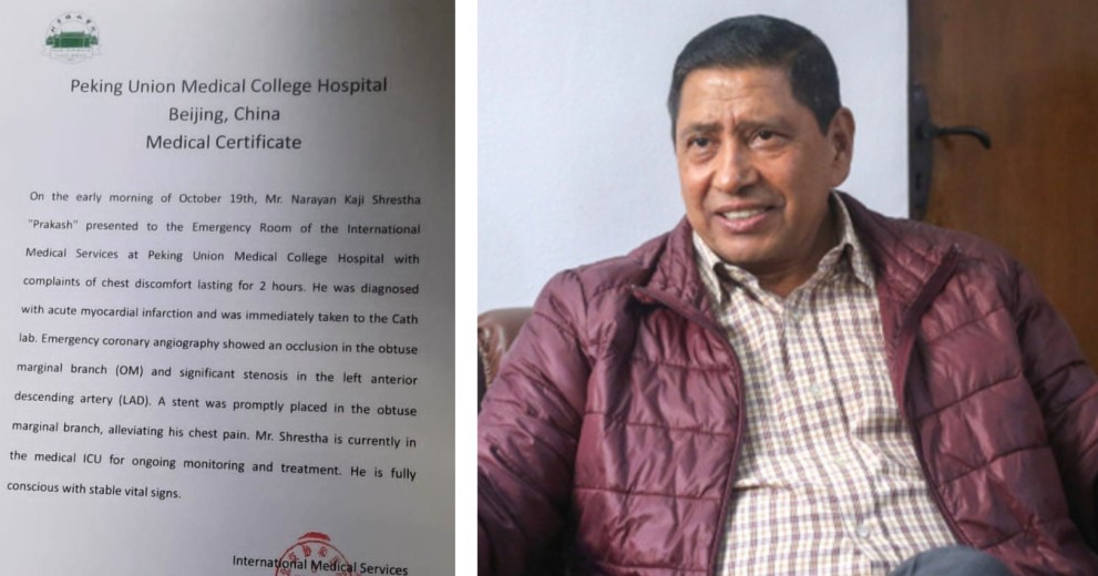 काठमाडौं । उपप्रधानमन्त्री एवं गृहमन्त्री नारायणकाजी श्रेष्ठको स्वास्थ्य अवस्थाबारे पेकिंग युनियन मेडिकल कलेज अस्पतालले ‘मेडिकल सर्टिफिकेट’ जारी गरेको छ । श्रेष्ठलाई ‘एक्युट मायोकार्डियल इन्फ्र्याक्सन’भएको र आकस्मिक कोरोनरी एन्जियोग्राफी गर्दा एउटा धमनीमा...