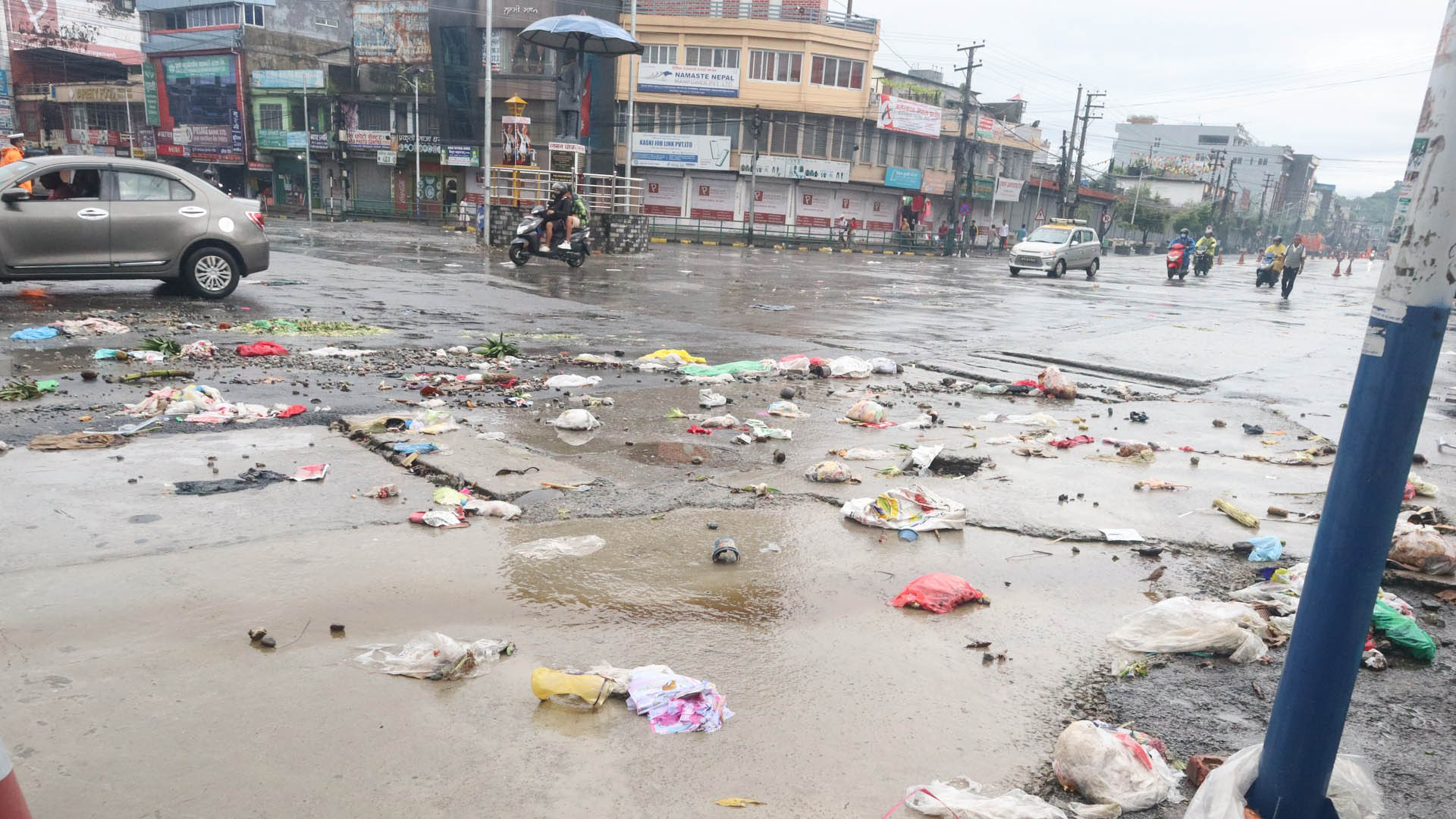 पोखरा । पोखराको मुख्य चोकहरुमा थुपारिएको फोहोर एक दिन उठाएपछि फेरि पोखरा महानगरभित्रको फोहोर उठन सकेको छैन । गत साउन १० गते बुधबारदेखि महानगरले फोहोर उठाउन नसकेपछि स्थानीयले सडक छेउमा लगेर थुपारेको फोहोर शनिबारको वर्षातले सडक र चोकहरुमा फाहोर छरपस्ट...