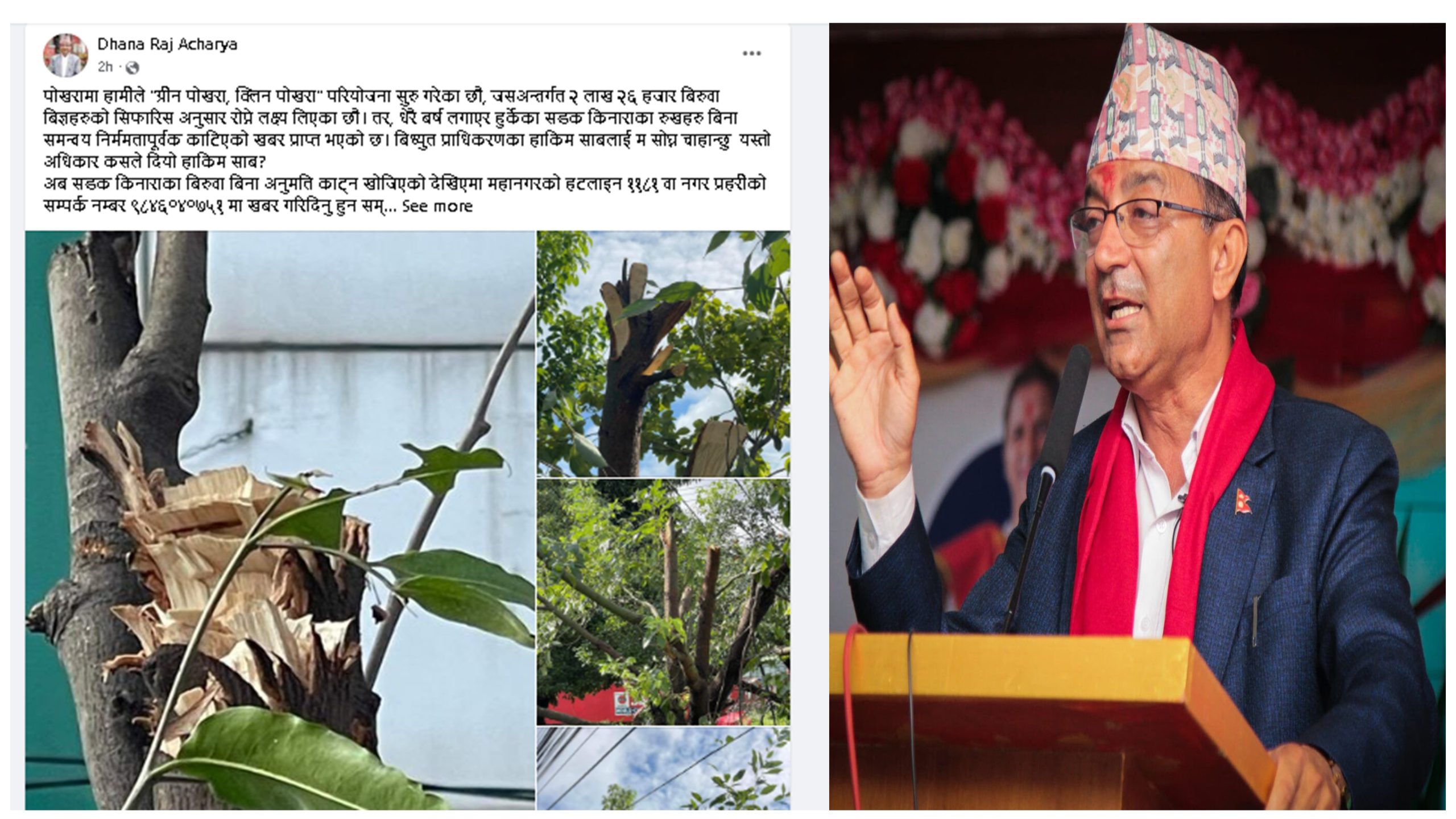 पोखरा । पोखरा महानगरपालिकाका प्रमुख धनराज आचार्यले धरै वर्ष लगाएर हुर्केका सडक किनाराका रुख बिना समन्वय नकाट्न आग्रह गरेका छन् । आइतबार समाजिक सञ्जाल फेसबुक मार्फत महानगरसंग समन्वय नगरी विद्युत प्राधिकरणले सडक किनारामा रहेका रुख काटेको भन्दै आक्रोस...