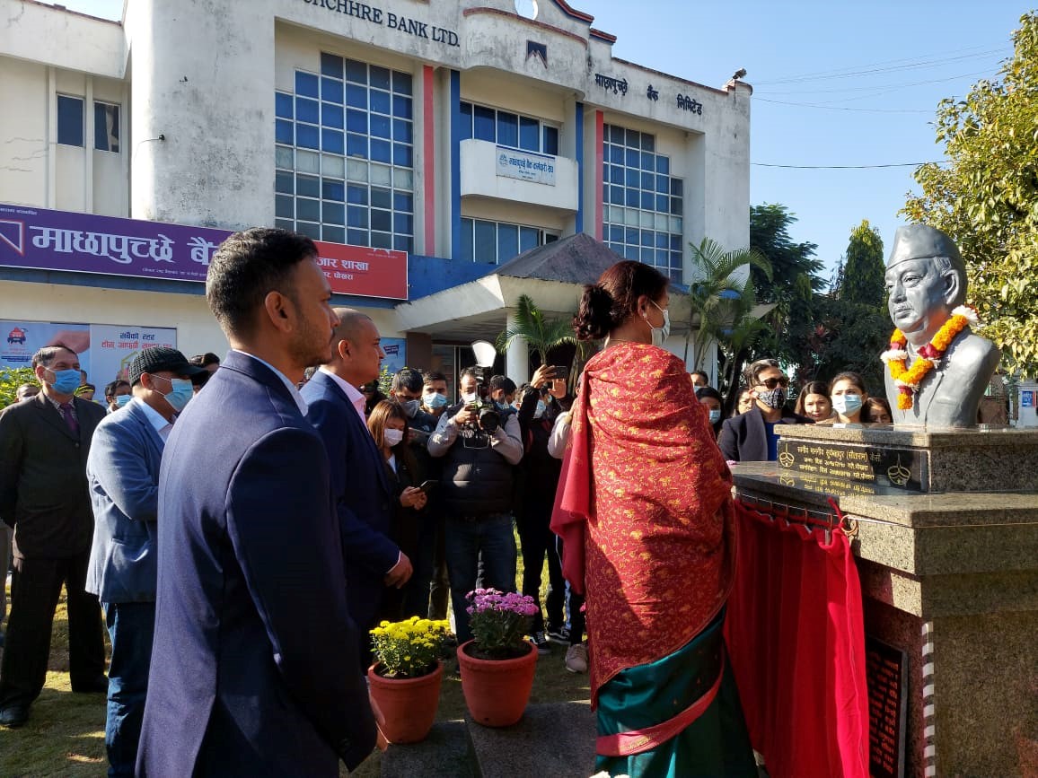 पोखरा । माछापुच्छ्रे बैंक पोखराका संथापक अध्यक्ष स्व. सूर्यबहादुर केसीको स्मृतिमा माछापुच्छ्रे बैंक पोखरा नयाँ बजारको कार्यालय परिसरमा अर्धकद शालिक स्थापना गरिएको छ । शालिकको आज एक कार्यक्रम बीच स्व. केसीका धर्मपत्नी प्रेम कुमारी केसीले अनावरण गरिन्...