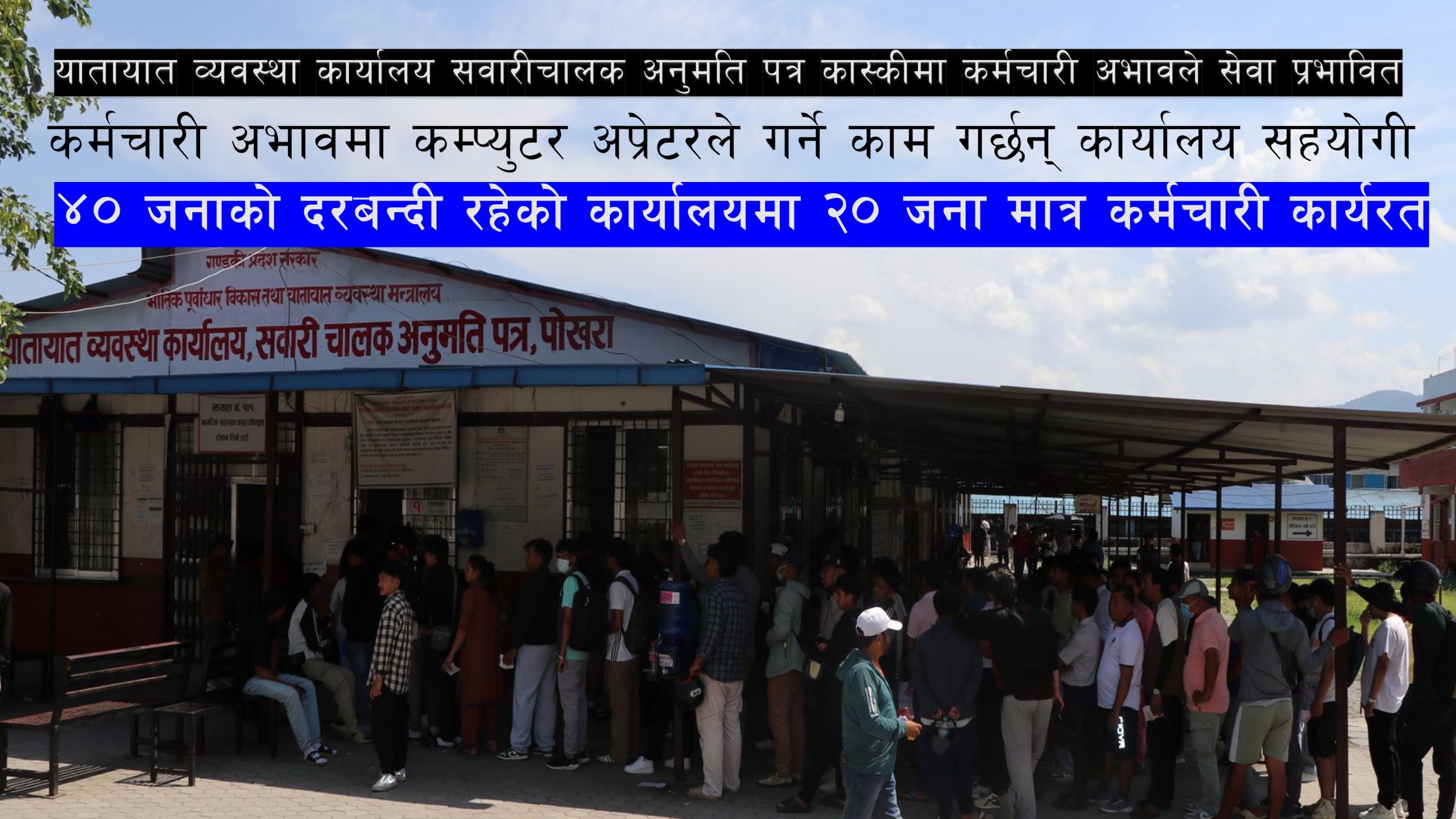 पोखरा । दैनिक झण्डै दुई हजार सेवाग्राहीले सेवा लिने यातायात व्यवस्था कार्यालय सवारीचालक अनुमति पत्र कास्कीमा कर्मचारीको अभावले सेवा नै प्रभावित भएको देखिएको छ । बिहिबार कार्यालयमा सेवाका लागि लाइनमा भेटिएका पोखरा ५ पस्र्याङ बस्ने डोलेन्द्र ढकाल आफू कार्यलयमा...