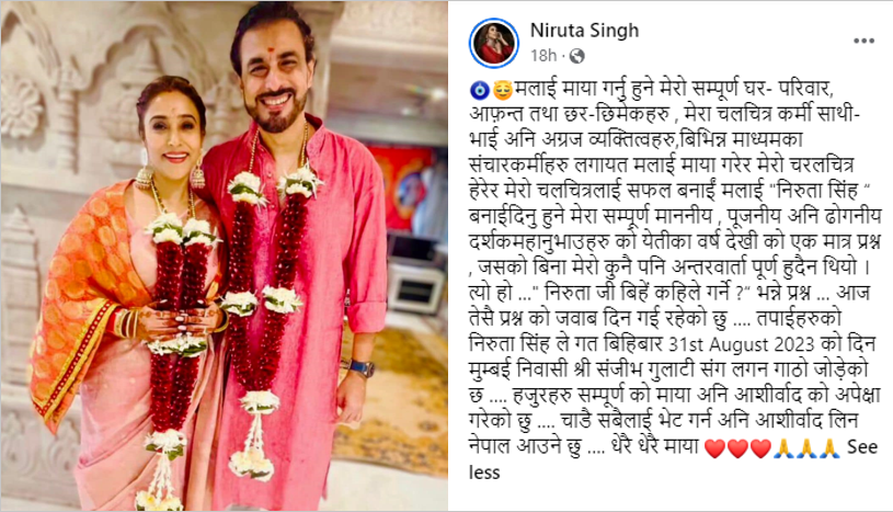 चर्चित नेपाली अभिनेत्री निरूता सिंहले बिहे गरेकी छन्।उनले मुम्बईका सञ्जीभ गुलाटीसँग लगनगाँठो कसेकी हुन्। शनिबार सामाजिक सञ्जाल फेसबुकमा स्टाटस लेख्दै उनले गत अगस्ट ३१ मा गुलाटीसँग बिहे गरेको जानकारी दिएकी हुन्। ‘यतिका वर्षदेखिको एक मात्र प्रश्न, जसको...