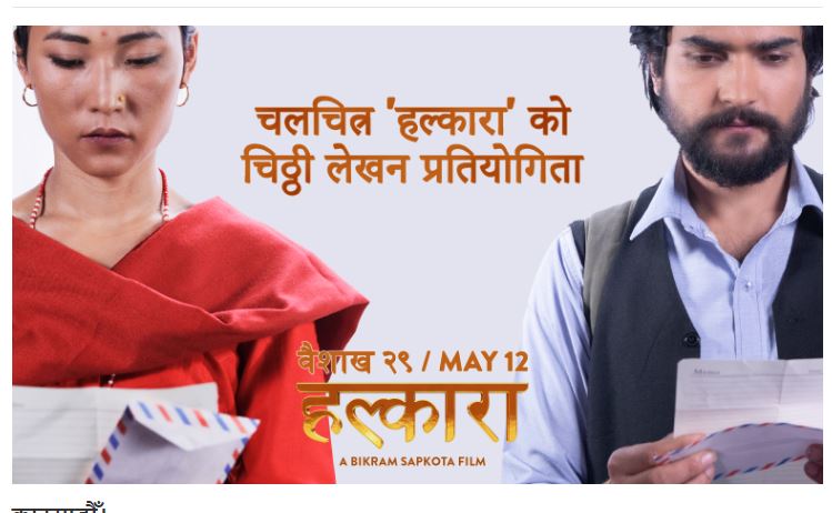 काठमाण्डौ । बैशाख २९ गते रिलिज हुने नेपाली चलचित्र ‘हल्कारा’ले चिठ्ठी लेखन प्रतियोगिता आयोजना गरेको छ । प्रतियोगितामा सहभागि हुन आफ्नो जीवनबाट टाढा भईसकेका, आफुले अत्यन्तै चाहेका, आफुले चाहेर पनि नपाएका अथवा आफुले सँधै सम्झिरहने व्यक्तिलाई पत्र लेख्नुपर्नेछ...