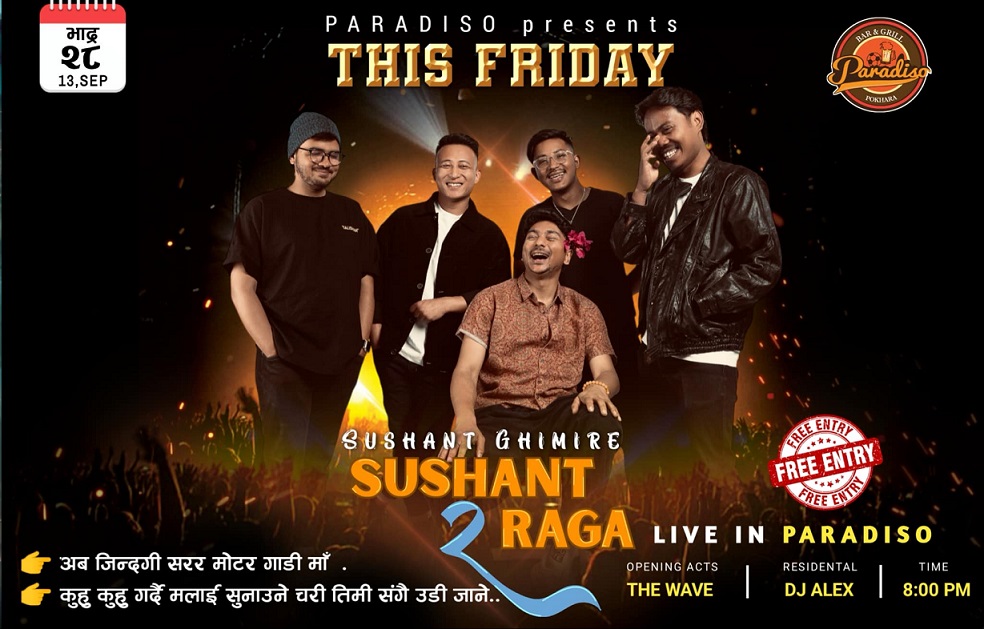 पोखरा । युवापुस्ता माझ प्रिय गायक शुसान्त घिमिरे आफ्ना गीत सहित पोखरा आउदै छन् । युवाहरुलाई मनोरञ्जन दिदै नचाउनका लागि पोखरा लेकसाइडमा रहेको प्याराडिसो स्पोर्टस् बार एन्ड ग्रिलमा ब्यान्डले लाइभ कन्सर्टमार्फत दर्शक नचाउने छन् । भदौ २८ गते प्याराडिसोमा...
