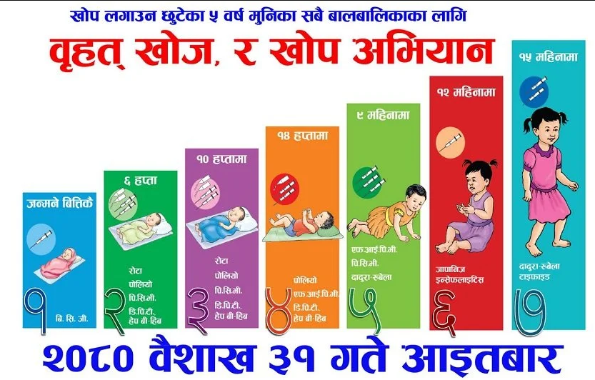 काठमाडौँ । आज बृहत् खोप अभियान, खोप लगाउन छुटेका ५ वर्ष मुनिका सबै बालबालिकालाई आज खोप लगाइँदै छ । स्वास्थ्य तथा जनसङ्ख्या मन्त्रालयका अनुसार देशैभरीका सबै सरकारी स्वास्थ्य संस्थाबाट राष्ट्रिय खोप तालिका अनुसार १५ महिना भित्रमा लगाउनु पर्ने नियमित खोप...