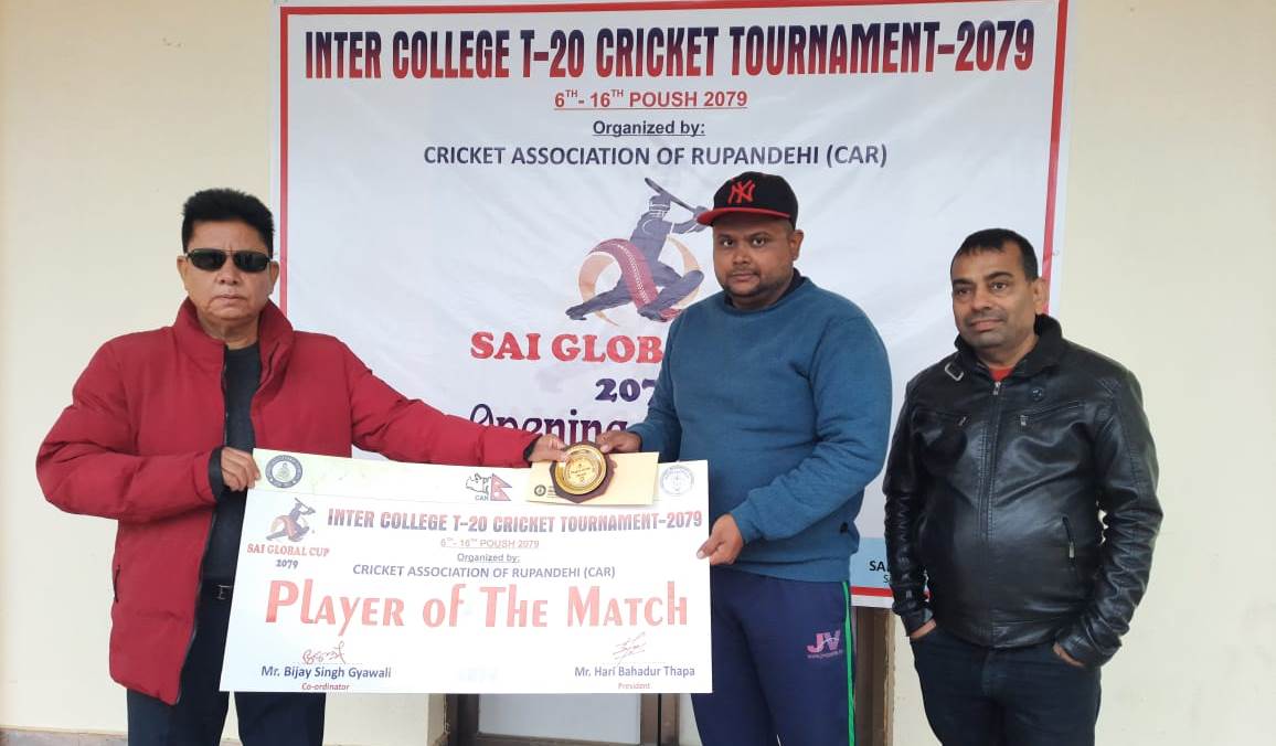 भैरहवा । अन्तरकलेज जिल्लास्तरीय ‘साई ग्लोबल कप–२०७९’ टी–२० क्रिकेट प्रतियोगिता अन्तर्गत मंगलबार भएका दुई खेलमा शान्ति नमूना उच्च मावि र साईग्लोबल एकेडेमी ‘बी’ विजयी भएका छन् । शान्ति नमूनाले लुम्बिनी इन्जिनियरिङ कलेजलाई १५ रनले र साई ग्लोबलले होराइजन...