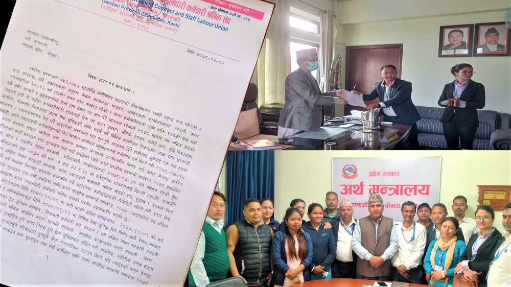 पोखरा । अखिल नेपाल सरकारी अस्थायी, करार तथा ज्यालादारी कर्मचारी श्रमिक संघ (आधिकारीक ट्रेड युनियन) गण्डकीले अस्थायी, करार तथा ज्यालादारी कर्मचारीहरुले आफूहरुलाई निशर्त स्थायी गर्न माग गदै गण्डकी प्रदेश सरकारलाई ९ बुदेँ ज्ञापन पत्र बुझाएको छ । अर्थ मन्त्री...