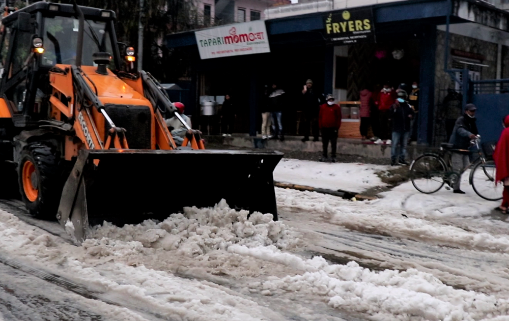 असिनाले सडक ढाकेपछि पोखराको महेन्द्रपुल, चिप्लेढुंगा, गैह्रापाटन र नदीपुर क्षेत्रमा सवारीसाधन सञ्चालनमा नै समस्या हुँदा डोजर चलाएर असिना पन्छाइएको छ । तस्बिर : विमल तिवारी/केन्द्र खबर