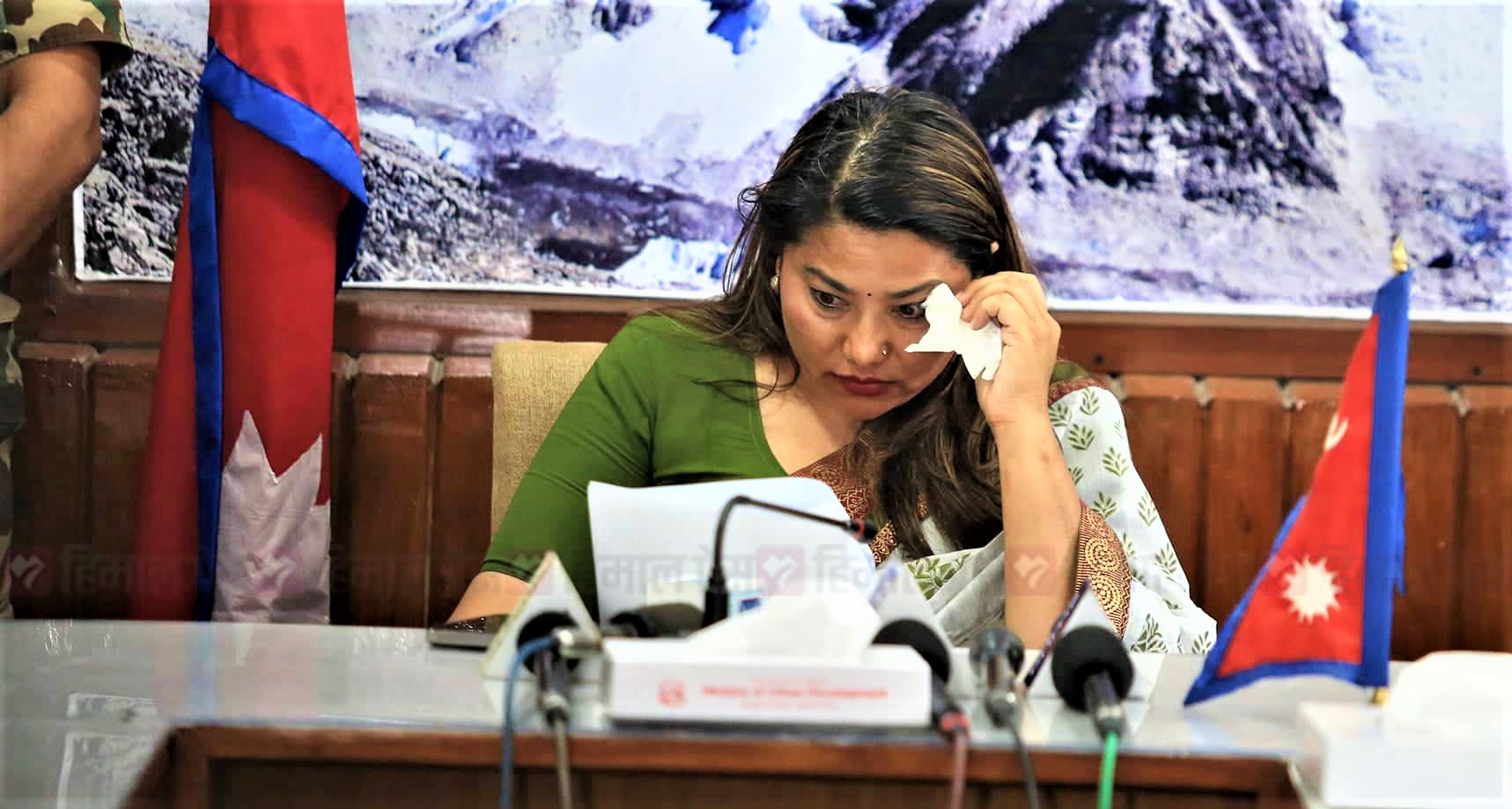 सहरी विकासमन्त्री रामकुमारी झाँक्री मन्त्रालयबाट बिदा हुन लाग्दा रोएकी छन् । मन्त्रालयमा आइतबार बेलुकी आयोजित पत्रकार सम्मेलन सुरुवातमै उनी रोएकी हुन् । उनी कार्यक्रम सुरु हुँदै गर्दा मन्त्री झाँक्री आफूले वाचन गर्ने पत्र हेर्दै टिस्यु पेपरले आँसु पुछेकी...