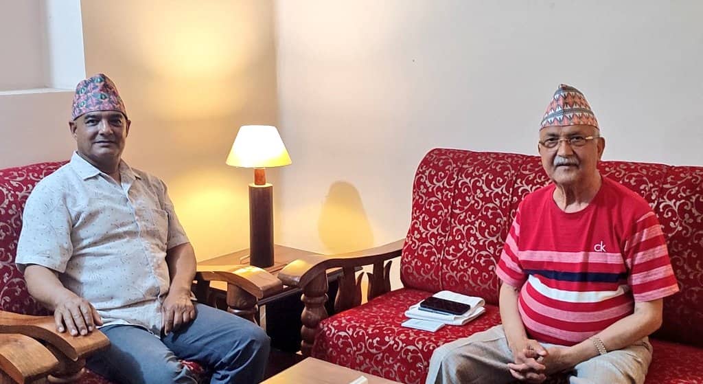 काठमाडौं । नेकपा एमालेका अध्यक्ष केपी शर्मा ओली र राप्रपाका महामन्त्री धवल शम्मशेर राणाबीच भेट भएको छ । नेपालगञ्जको स्नेहा होटलमा बिहीबार राति दुई नेताबीच समसामयिक राजनीतिक घटनाक्रमबारे कुराकानी भएको हो । अध्यक्ष ओली र महामन्त्री राणाबीच समसामयिक राजनीतिक...
