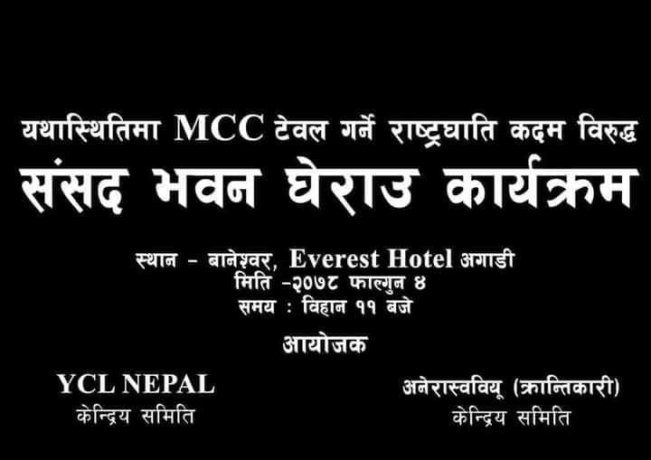 काठमाडौं । अमेरिकी सहयोग परियोजना एमसीसी आजको संसदमा टेबल हुने सम्भावना बढेपछि सत्तारुढ दल नेकपा माओवादी केन्द्र र नेकपा एकीकृत समाजवादी भ्रातृ संगठनले संसद भवन घेर्ने भएका छन् । माओवादीको युवा संगठन वाइसियल र नेकपा एसको विद्यार्थी संगठन अनेरास्ववियूले...