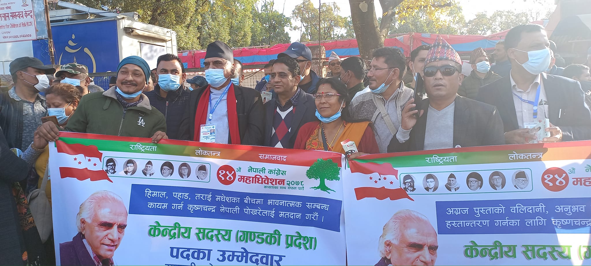 काठमाडौँ । नेपाली कांग्रेसको केन्द्रीय सदस्यमा उम्मेदवारी दिएका गण्डकी प्रदेशका मुख्यमन्त्री कृष्णचन्द्र नेपाली पोखरेल पतिनिधिसंग मत माग्न व्यस्त छन् । मतदान स्थल भृकुटीमण्डपमा जम्मा भएका महाधिवेशन प्रनितिनिधिसंग पोखरेलले मतदानका लागि आग्रह गरेका हुन्...