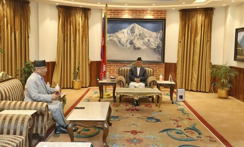 काठमाडौँ । राष्ट्रपति रामचन्द्र पौडेल र प्रधानमन्त्री पुष्पकमल दाहाल ‘प्रचण्ड’बिच आज बिहान भेटवार्ता भएको छ । राष्ट्रपति भवन शीतल निवासमा भएको भेटवार्तामा समसामयिक विषयमा कुराकानी भएको राष्ट्रपतिको स्वकीय सचिवालयले जनाएको छ ।