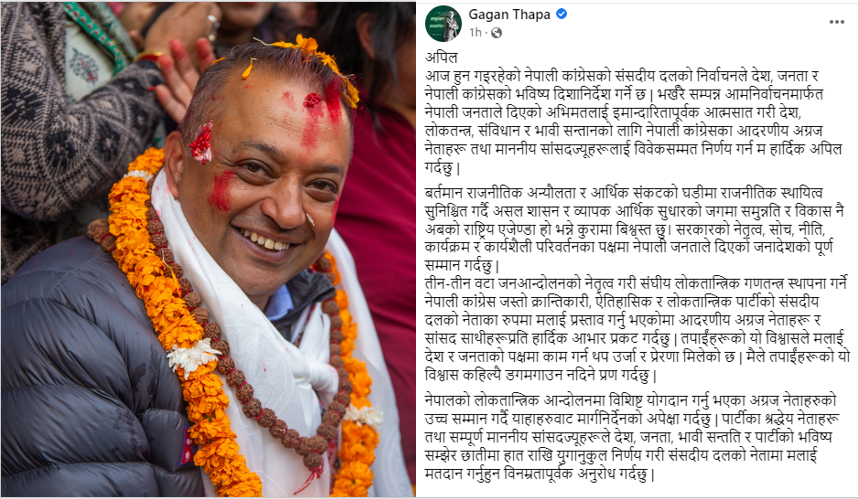 काठमाडौं । नेपाली कांग्रेस संसदीय दलका उम्मेदवार गगन थापाले पार्टीका सांसदहरुलाई विवेकसम्मत निर्णय गर्न अपिल गरेका छन् । बुधबार विहान सामाजिक सञ्जालमार्फत कांग्रेस महामन्त्री थापाले देश, जनता, भावी सन्तति र पार्टीको भविष्य सम्झेर आफूलाई मतदान आग्रह गरेका...