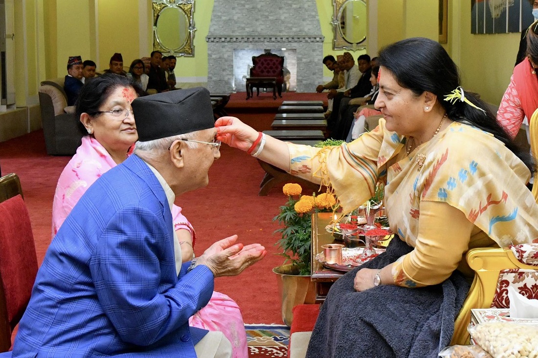 नेकपा एमालेका अध्यक्ष केपी शर्मा ओली दम्पत्तीले राष्ट्रपति विद्यादेवी भण्डारीको हातबाट टिका लगाएका छन् । बुधबार बिहान दमकस्थित आफ्नै निवासमा बिहान ११ बजेर ५१ मिनेटको शुभसाइतमा बुबा मोहनप्रसाद ओलीको हातबाट टिका ग्रहण गरेर ओली दम्पत्ती राष्ट्रपतिको हातबाट...