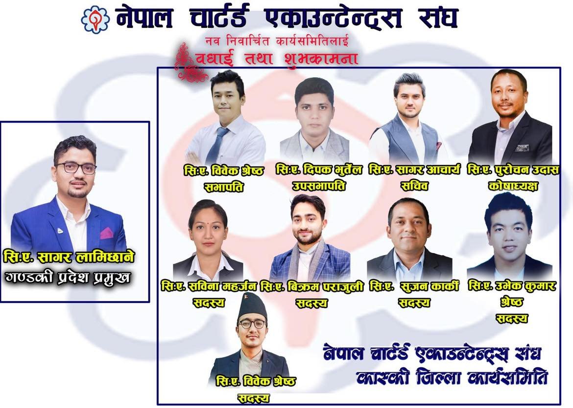पोखरा । नेपाल चार्टड एकाउन्टेन्टसको नयाँ कार्यसमिति चयन भएको छ । चार्टड एकाउन्टेन्टसको छाता संगठन नेपाल चार्टड एकाउन्टेन्ट्स संघको ३४ औं कार्यसमितिको निर्वाचनले नयाँ कार्यसमिति चयन गरेको हो । शनिबार असार ११ गते भएको निर्वाचनमा गण्डकी प्रदेश प्रमुखमा सिए...