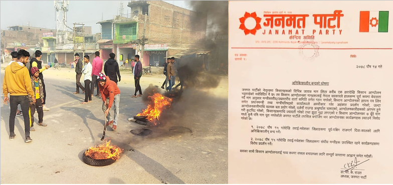जनकपुरधाम । सीके राउत नेतृत्वको जनमत पार्टीले थप आन्दोलनको घोषणा गरेको छ । किसानको निहुँमा आन्दोलन चर्काउदै आएको यस पार्टीले आजदेखि पूर्वपश्चिम राजमार्ग अनिश्चितकालका लागि बन्दको घोषणा गरेको छ । पार्टी अध्यक्ष डा.सीके राउतले बुधवार अबेर राति विज्ञप्ती...