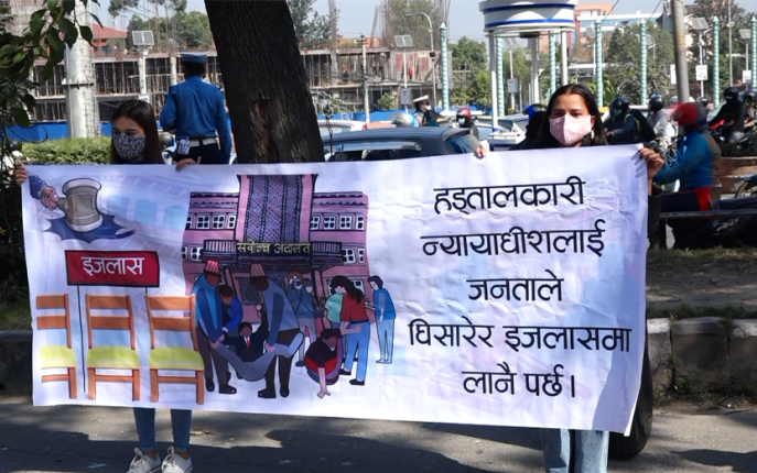 काठमाडौं । कानूनका विद्यार्थीहरुले आज इजलास बहिष्कार गर्ने न्यायाधीशहरुको विरुद्धमा माईतीघरमा प्रदर्शन गरेका छन् । विद्यार्थीहरुले छोटो सडक नाटकसमेत देखाएका थिए । उनीहरुले प्रदर्शनको क्रममा देखाएको ब्यानरमा ‘हड्तालकारी न्यायाधीशलाई इजलासमा घिसारेर लानैपर्छ’...