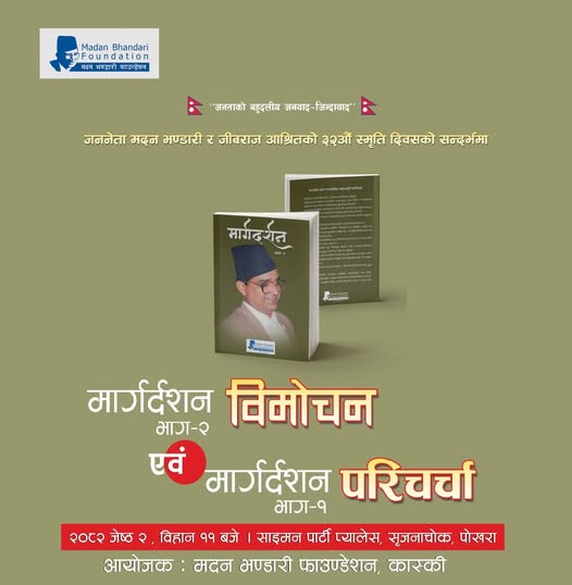 पोखरा । मदन भण्डारी फाउन्डेसन कास्कीले जननेता मदन भण्डारी र जिवराज आश्रितको ३२ औं स्मृति दिवस मनाउने भएको छ। सो अवसरमा फाउन्डेसनले प्रकाशन गरेको मार्गदर्शन भाग दुइको विमोचन सहित भाग एकको परिचर्चा कार्यक्रम आयोजना गरिएको अध्यक्ष माधव बास्तोलाले जानकारी...