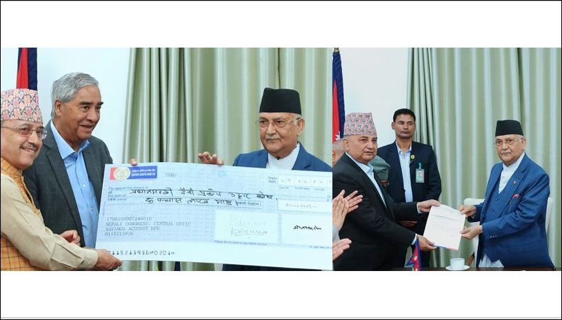 काठमाडौँ । नेपाली कांग्रेस र नेकपा एमालेले प्रधानमन्त्री प्रधानमन्त्री दैवी प्रकोप उद्धार कोषमा आज ५०/५० लाख हस्तान्तरण गरेका छन्। आइतबार कांग्रेसका सभापति एवं पूर्वप्रधानमन्त्री शेरबहादुर देउवासहितको टोलीले हालैको प्राकृतिक विपद्पछिको अवस्थामा तत्काल...