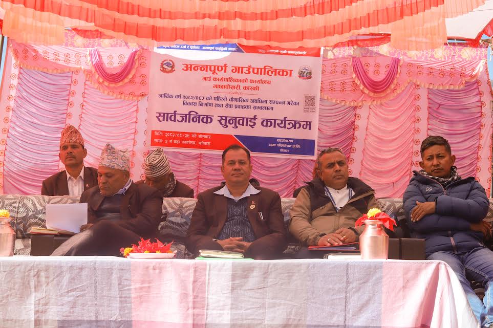 पोखरा । कास्कीको अन्नपूर्ण गाउँपालिकाले चालु आर्थिक वर्ष २०८२-०८३ को पहिलो चौमासिक प्रगतिबारे सोमबार सार्वजनिक सुनुवाई आयोजना गरेको छ। अन्नपूर्ण गाउँपालिका वडा नं ५ को कार्यालय झोबाङमा सम्पन्न कार्यक्रममा गाउँपालिकाका प्रमुख प्रशासकीय अधिकृत चिरञ्जीवी...