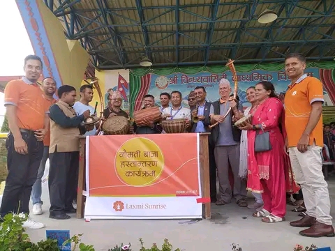 पोखरा। लक्ष्मी सनराईज वैंकले वाटुलेचौरस्थित विन्ध्यवासिनी माध्यमिक विद्यालयलाई नौमती बाजा हस्तान्तरण गरेको छ । परम्परागत लोक संस्कृति सहित बाजाको संरक्षण तथा पर्वद्घन गर्ने हेतुले बाजा हस्तान्तरण गरिएको वैंकका वगर शाखा कर्जा अधिकृत विकास आचार्यले जानकारी...