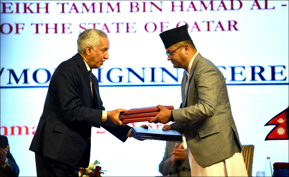 काठमाडौँ । नेपाल र कतारबिच द्विपक्षीय सम्झौता सम्पन्न भएको छ । प्रधानमन्त्री प्रचण्ड र कतारी अमिर शेख तमिम बिन हमाद अल थानीबिचको भेटवार्तापछि विभिन्न आठ विषयमा सम्झौता भएको हो । यस्तै छ वटा विषयमा सझादारी पनि भएको भएको परराष्ट्र मन्त्रालय स्रोतले जनाएको...