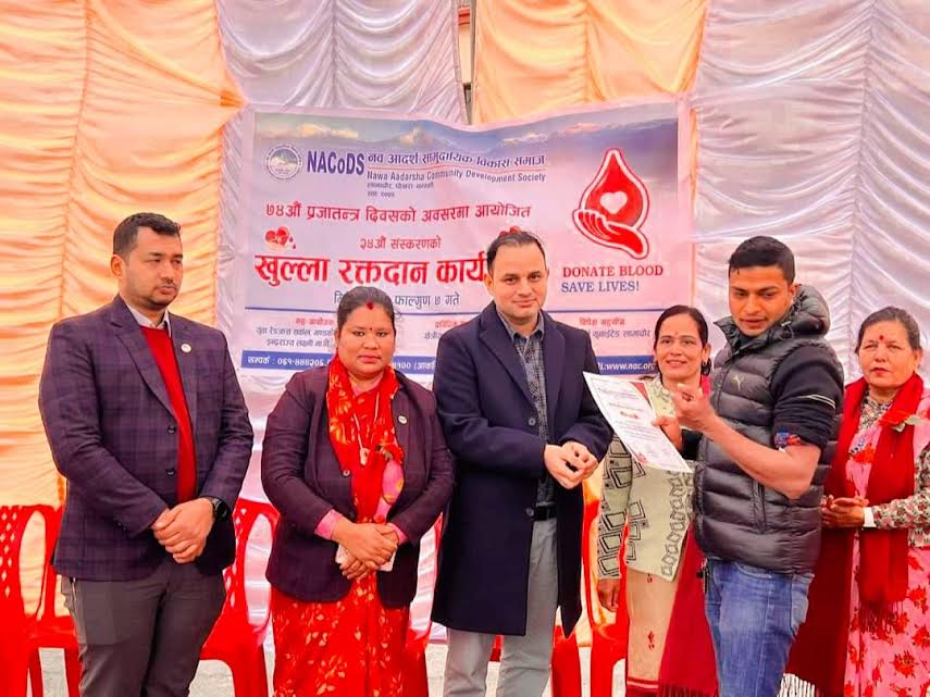 पोखरा । नव आर्दश सामुदायिक विकास समाज पोखरा–१६ लामाचौरले आयोजना गरेको रक्तदानमा ३० पिन्ट रगत संकलन भएको छ । समाजले आयोजना गरेको २४ औं रक्तदानमा २९ पुरुष र १ महिलाले रक्तदान गरेका हुन । ७४ औं प्रजातन्त्र दिवसको अवसरमा एल सी ब्रर्दश युनाईटेडको विशेष सहयोग...
