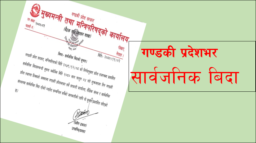 गण्डकी प्रदेशमा यही शुक्रबार सार्वजनिक बिदा हुने भएको छ। मुख्यमन्त्री तथा मन्त्रिपरिषद कार्यालयले बुधबार सूचना निकालेर शुक्रबार बिदा दिइएको उल्लेख गरेको छ।कार्यालयका उपसचिव प्रवीण ढकालले निकालेको सूचनामा फागुन ४ गते शुक्रबारका दिन सार्वजनिक बिदा दिइएको...